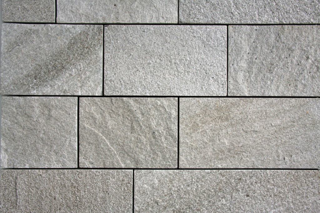 Quarzit-Schiefer in Silbertönen in einer Stärke von ca. 20 mm. Die Höhe beträgt 100 oder 200 mm und die Länge variiert.